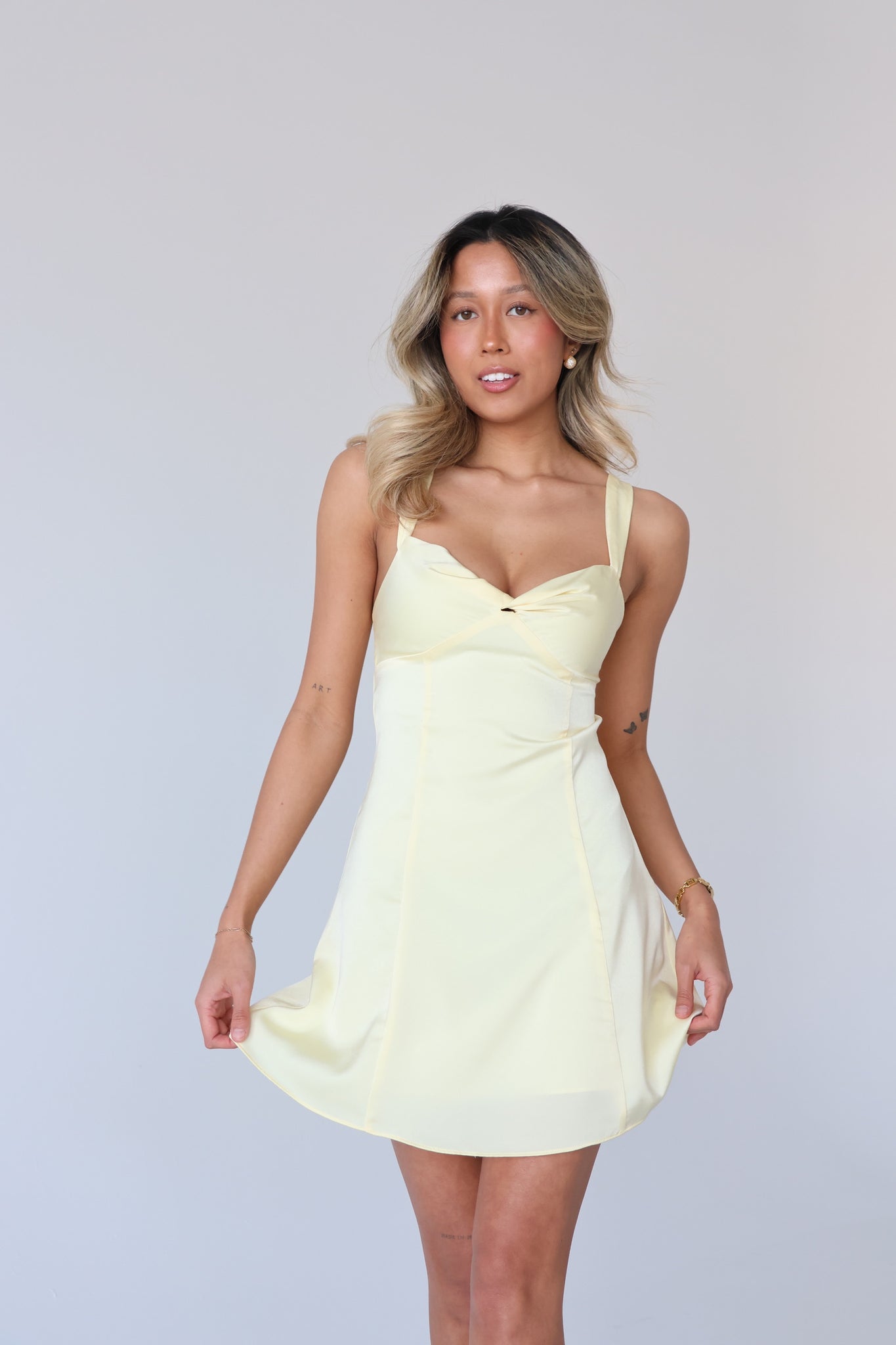 this buttery yellow mini dress is the ultimate warm-weather statement. Designed with a flattering sweetheart neckline and subtle bust detailing, the fitted bodice enhances your shape while offering a soft, feminine silhouette. The lightly flared skirt adds effortless movement for a playful finish.