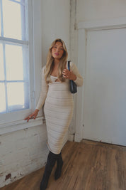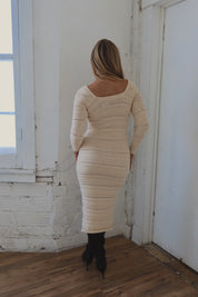 Our Juliette Knit Midi Dress is a knit midi dress with unique knit details throughout. This long sleeve midi dress is made out of a unique taupe crochet material that is lightweight and has stretch throughout and gives this dress a figure flattering fit. This dress features sweetheart neckline with a keyhole cut out in the bust, fitted bodice, and stretchy elastic neckline. This dress made of a lightweight and breathable knit material that is great for any time of year. This dress is completed with midi length skirt